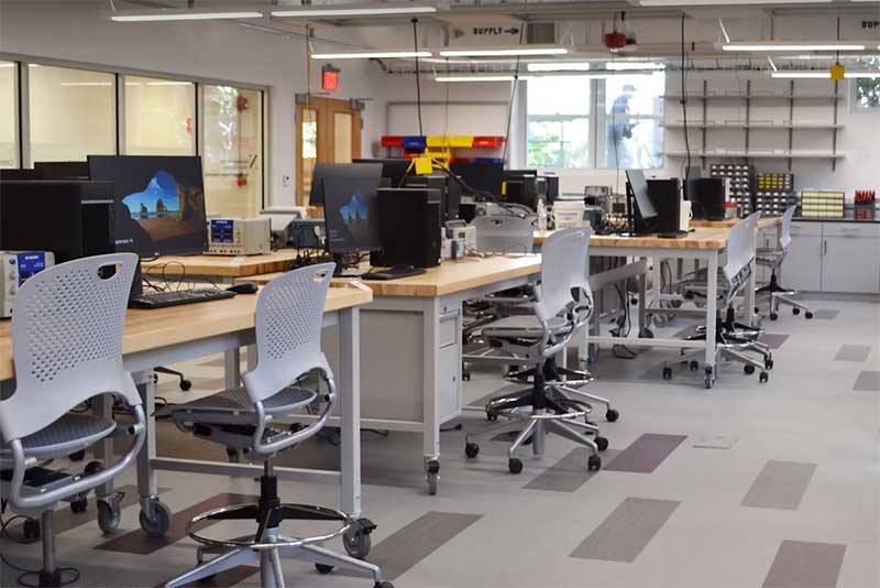 The academic program is supported by extensive laboratory facilities for study and experimentation in computing, circuit analysis, electronics, digital systems, microwaves, control systems, semiconductor processing, very large-scale integration (VLSI) design, and digital signal processing. Students have access to state-of-the-art computing facilities, including numerous Linux and Windows-based workstations. Many courses are taught in one of the four computer-based teaching classrooms. Two introductory electrical and computer engineering courses meet in integrated lab-classrooms where students and professors, assisted by undergraduate and graduate teaching assistants, work together on both theoretical and practical aspects of a wide range of signal processing and computing systems.